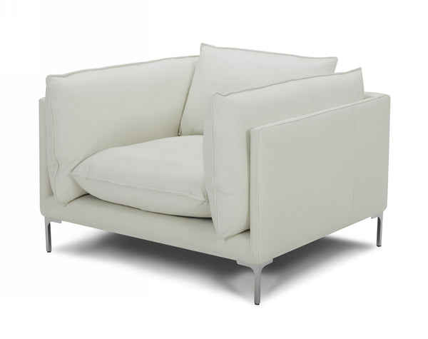When you think of comfortable arm chairs, you probably think of something that has oversized cushions. This modern chair, which is available in white L-grade leather, is a chair that fits that bill. With its oversized seat and back cushions, and its two-arm cushions, this contemporary chair will provide endless style and comfort. Thanks to its self-welt detailed leather cushions, chrome bracket style legs and tight upholstered frame, this chair is every modern furniture lovers' dream.