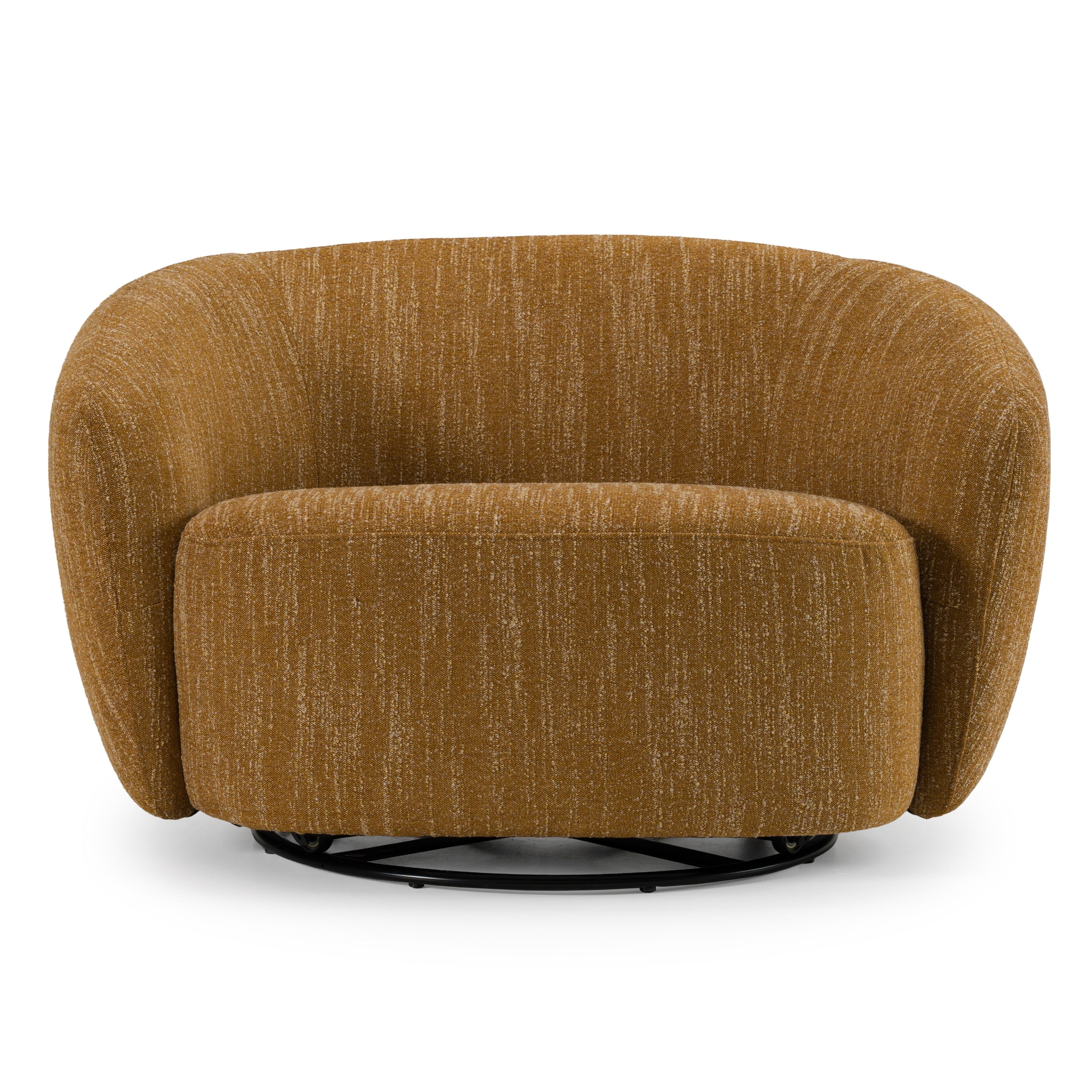 Sit back and relax in style with the Norris Swivel Accent Chair! This modern piece sports a rounded and sloped design that offers stylish, comfortable seating. Upholstered in mellow mustard fabric, the Norris is the perfect pop of color to bring into your home. The swivel base allows for a full 360 degree rotation. The collection also includes a matching three-seater sofa.