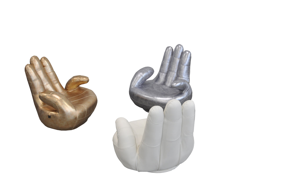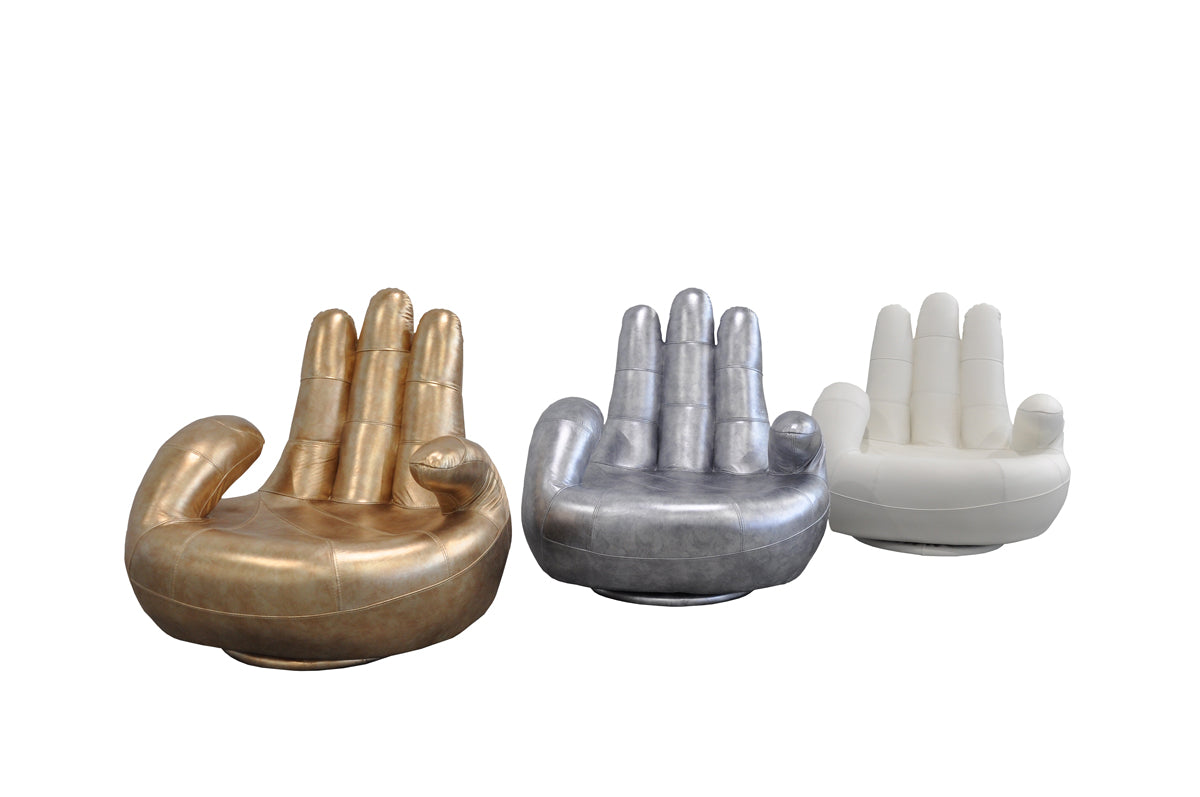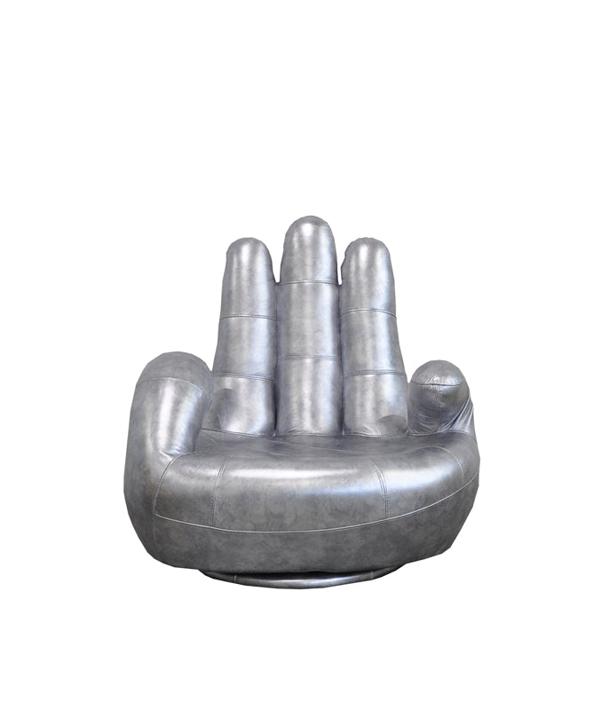 Designed like a human hand, the Estro Salotti Sosia Italian Modern Silver Leather Hand Accent Chair is a definite wow! Wrapped in silver full genuine leather, it incorporates the lines found on a human palm, including the lines on the fingers. The wide palm serves as the seating area while the 3 middle fingers were fitted side-by-side to function as the backrest. Both the thumb and small finger were designed as arms. This work of art showcases the imaginative artistry of the creator that is so different from the usual furniture design. To make your seating experience more enjoyable, this modern hand accent chair has a wood swivel base.