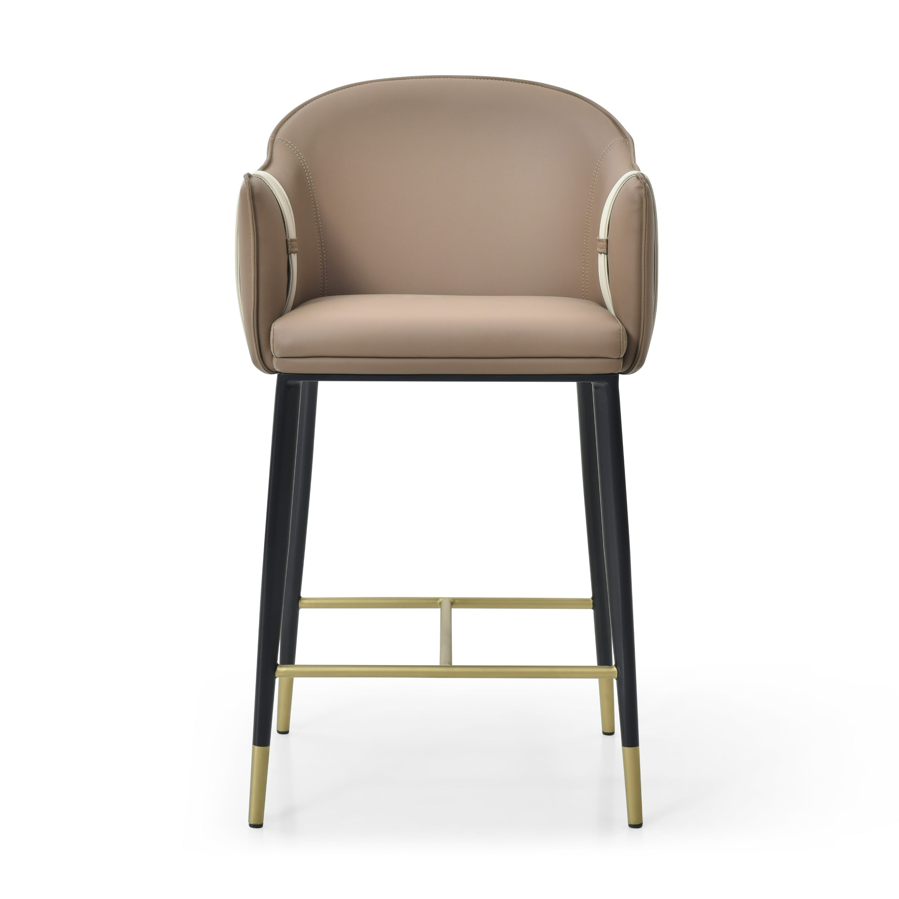 Introducing the Modrest Calder Modern Brown & Beige Vegan Leather Counter Chair, a stunning addition to any contemporary space. This elegantly designed counter stool features a chic curved backrest and plush seating, upholstered in a sophisticated blend of brown and beige vegan leather. Its sleek black legs are complemented by a stylish gold footrest, enhancing its modern aesthetic. Perfect for kitchen islands or trendy bars, this chair blends comfort and style seamlessly, making it a focal point in your interior decor.