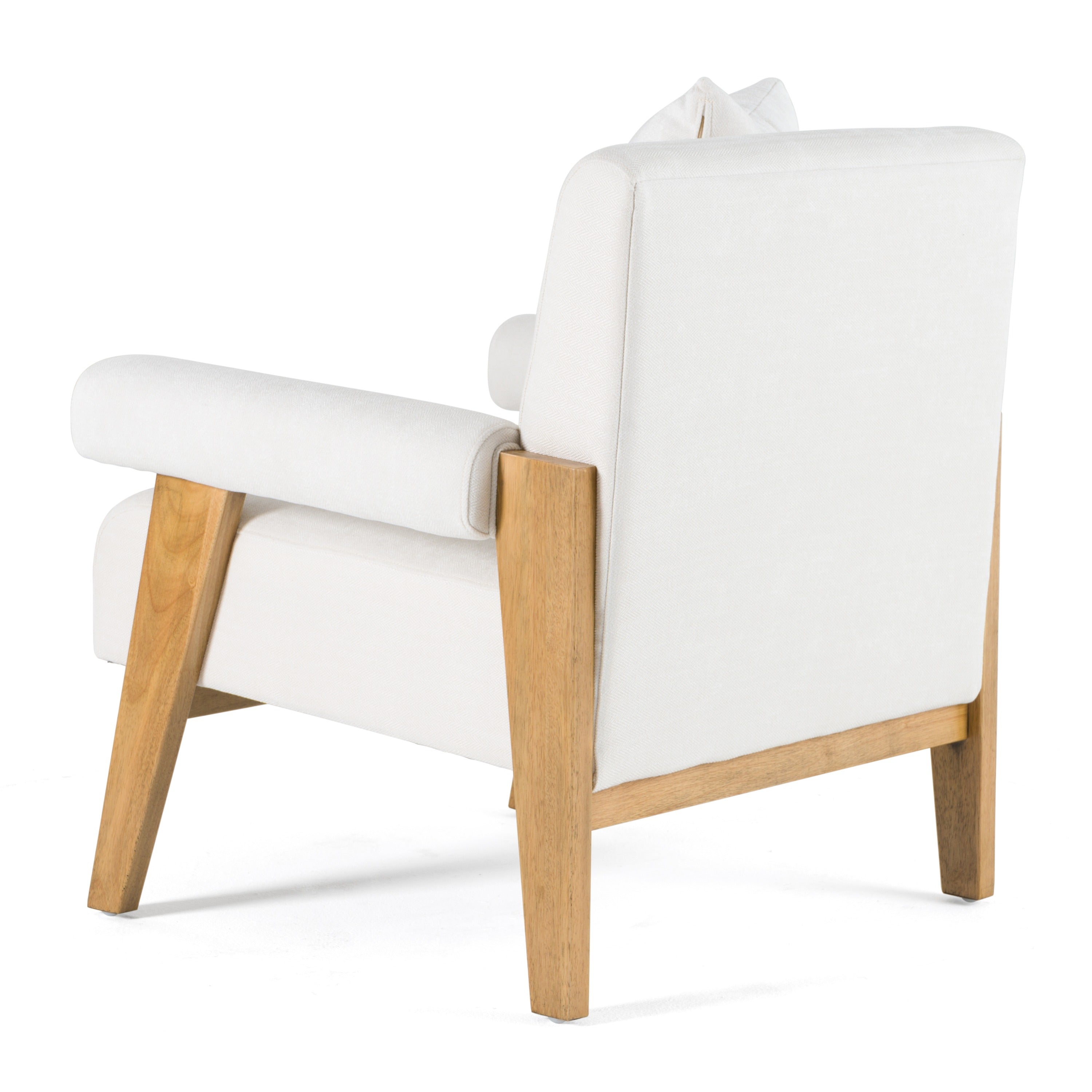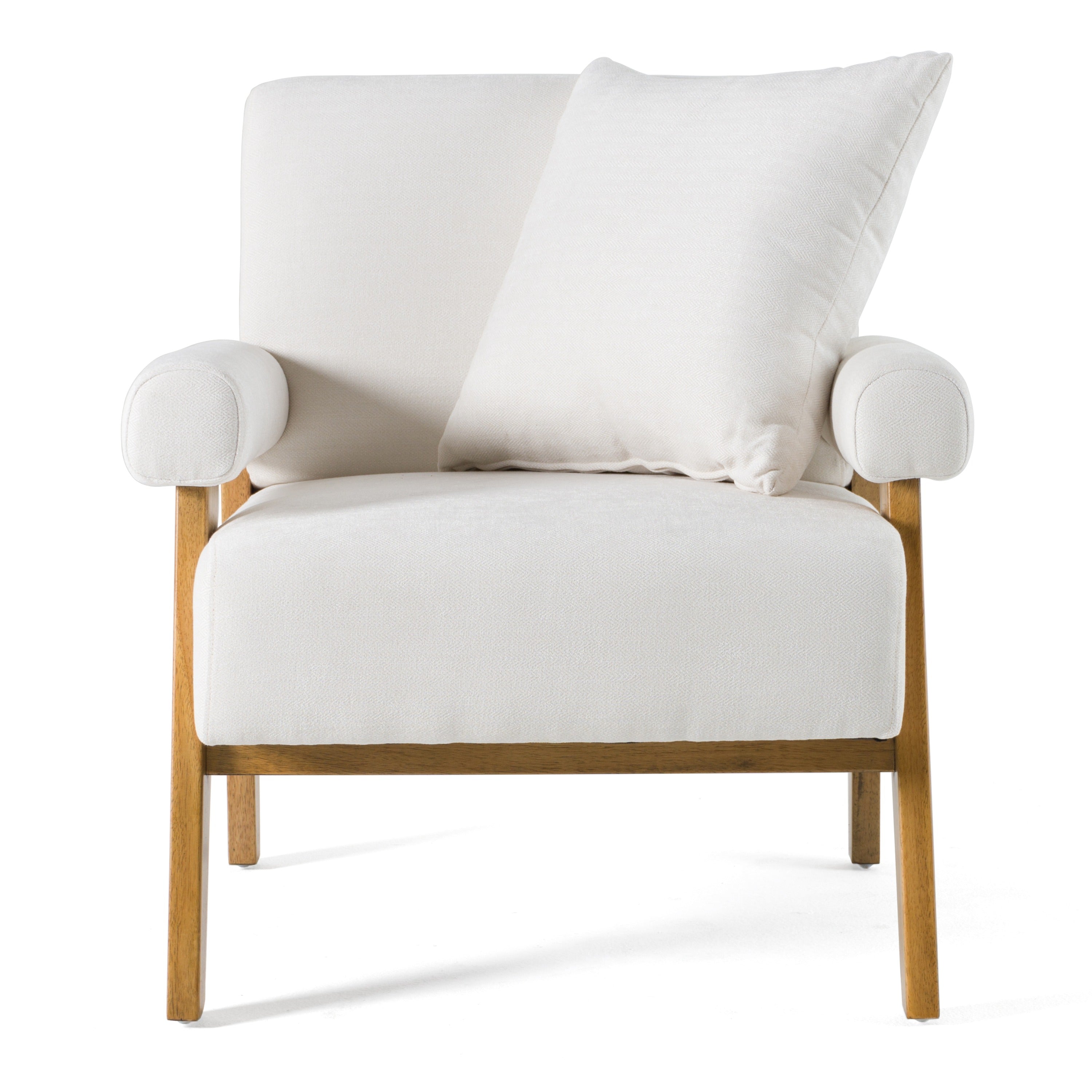 The Modrest Cynthia - Modern White Fabric & Wood Accent Chair is an elegant and comfortable addition to any modern living space. This accent chair is upholstered in 100% polyester fabric, offering a soft and durable surface in a crisp white color . The chair features a sturdy frame made from solid rubberwood and manufactured wood, finished in a light chestnut hue, adding a touch of natural warmth. The cushion back, round arms, and included toss pillow enhance comfort, while the pocket spring seat construction ensures long-lasting support. This fully assembled chair has a weight capacity of 200 lbs and is easy to maintain with a simple wipe of a dry cloth.