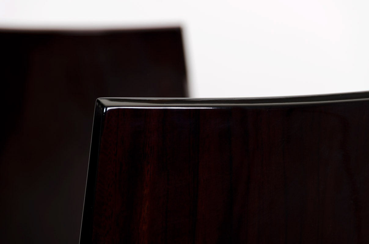 Finished in a rich ebony lacquer veneer, the Noble side chair matches perfectly with the rest of the Noble collection. Made to last, the Noble side chair was constructed with a sturdy back support and upholstered with extra padding in the light brown authentic leather cushioning.