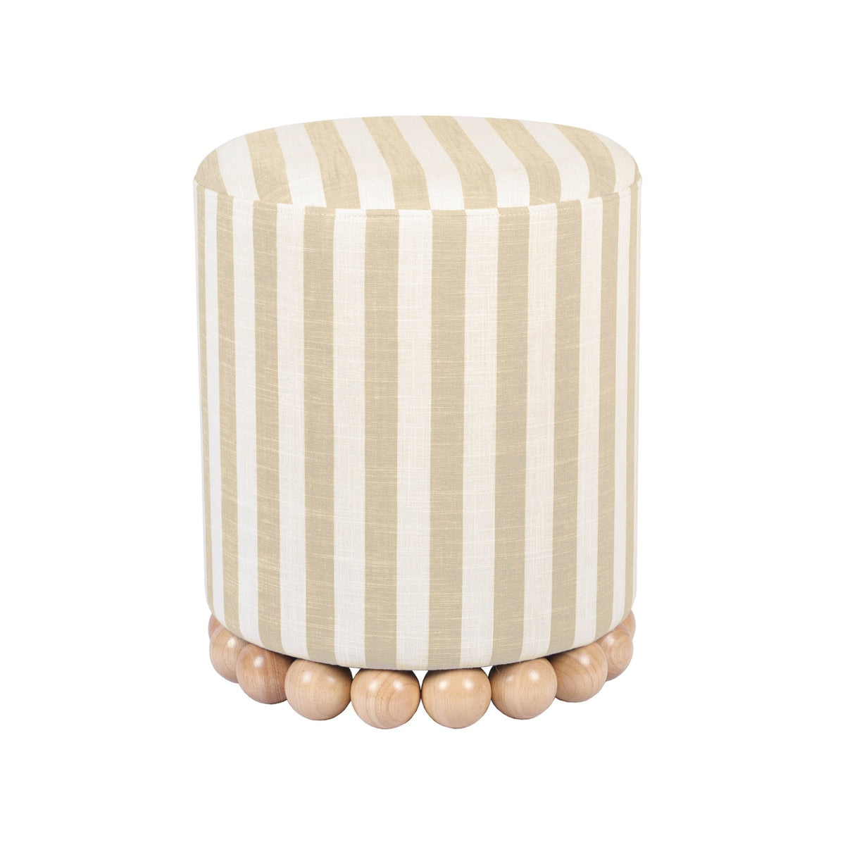 Introducing the Dex Ottomans, a charming and whimsical addition to your space that beautifully blends fresh design with a vibrant tropical vibe. The solid wood spherical orbs at the base create a striking visual element, ensuring a sturdy yet stylish foundation. Choose from playful washed linen-style cabana stripes, eco-friendly upcycled fabric, or bold leopard print jacquard to infuse personality into any room. Perfect for extra seating or as a chic footrest, these ottomans are available in a delightful palette of beige or pastel blue linen, faded blue or cream upcycled fabric, and taupe or olive green leopard prints. Transform your space with a touch of fun and flair!