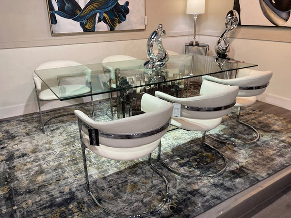 The Modrest Allie Contemporary White Leatherette Dining Chair features soft edges in white leatherette upholstery with a half-moon shape stainless steel base. This white leatherette dining chair is also available in black.