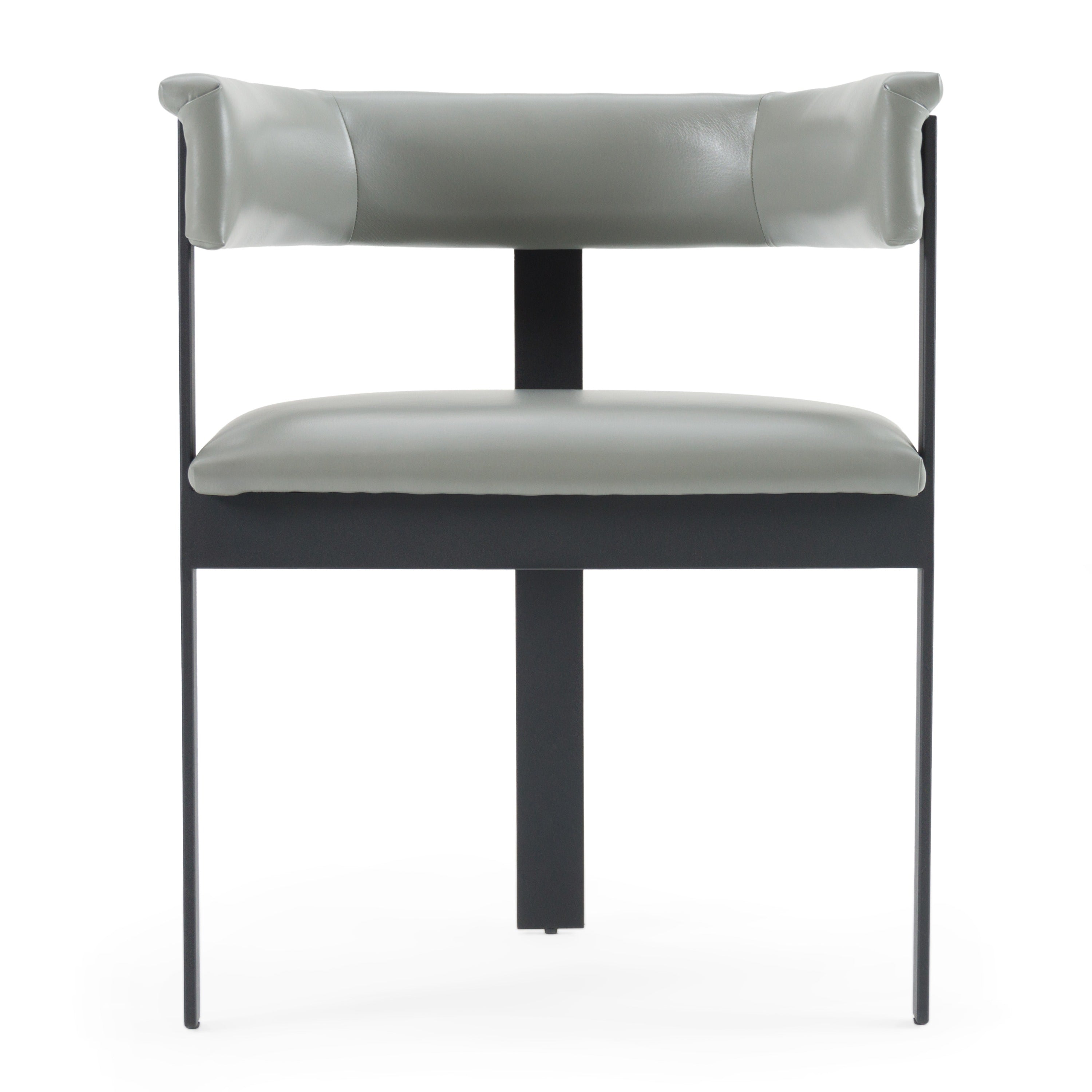 The Modrest Boswell dining chair exudes contemporary elegance with its sleek lines and minimalist form. Upholstered in a sophisticated grey faux leather, this chair brings a sense of understated luxury to any dining setting. The rounded, wrap-around backrest adds a soft, inviting touch, while the sturdy black metal frame provides modern contrast and support. Perfectly blending comfort with high design, the Boswell dining chair becomes a refined accent that elevates your dining experience, seamlessly integrating into chic, modern interiors.