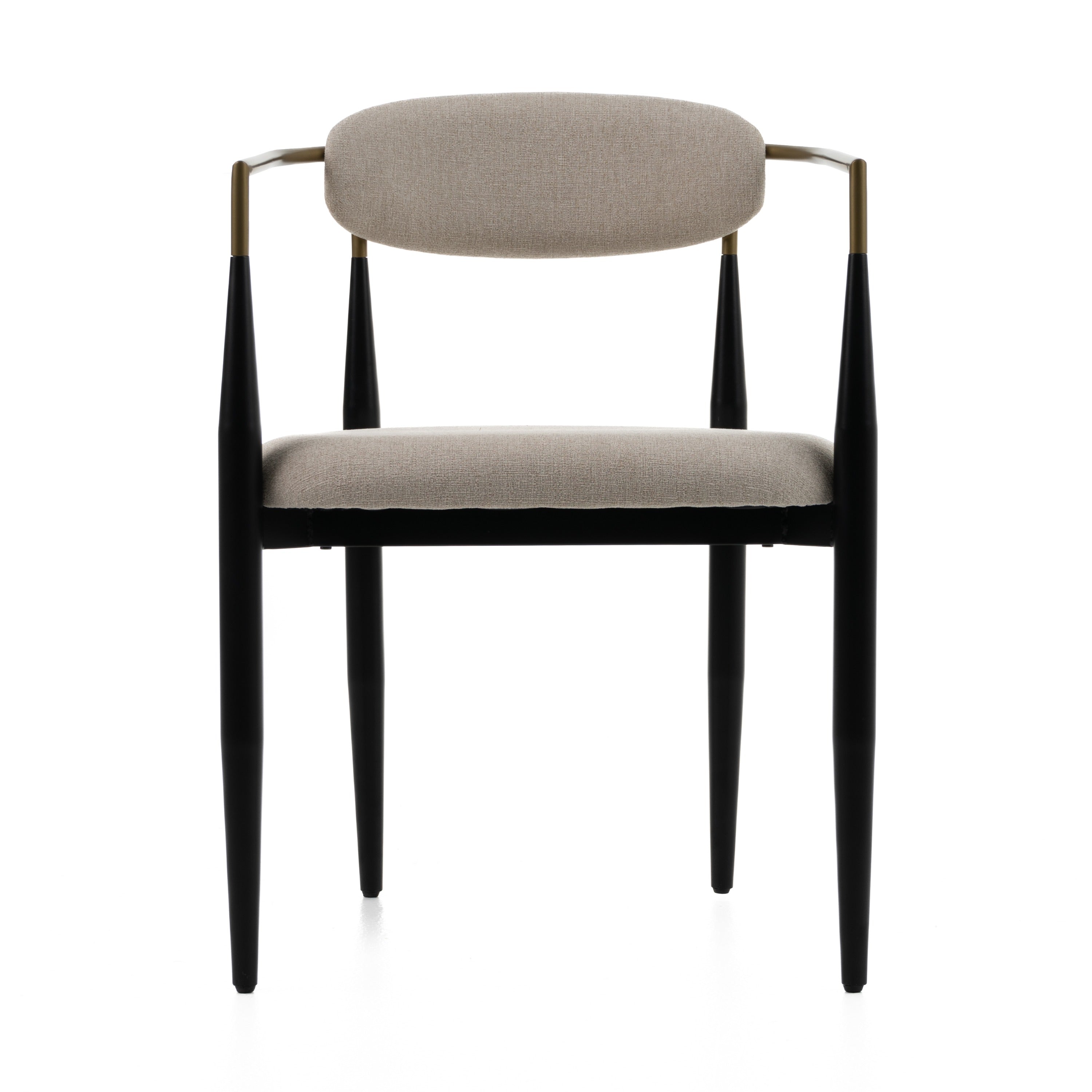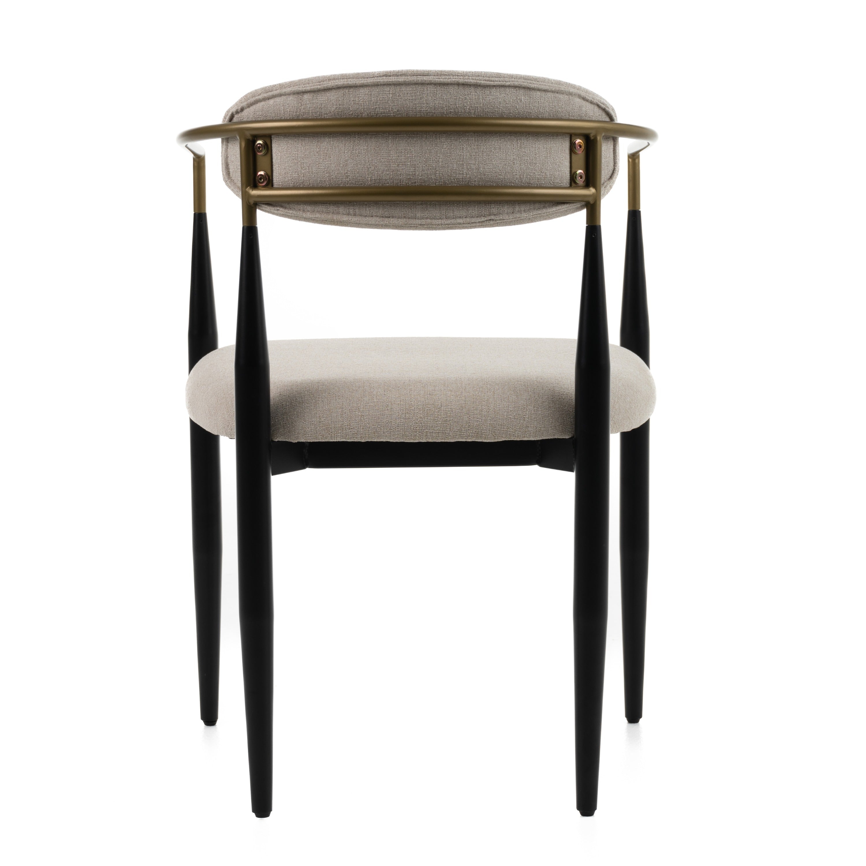 The Modrest Buchtel Dining Chair brings a touch of timeless mid-century modern elegance to any dining space. Wrapped in soft beige fabric, this chair is complemented by sleek black legs and refined gold accents on the armrests, creating a striking contrast that s both sophisticated and inviting. Its gently curved back and plush seating offer exceptional comfort, while the minimalistic design captures a sense of effortless style. A perfect blend of form and function, the Buchtel Dining Chair embodies a chic, understated luxury that will elevate the ambiance of any modern home.