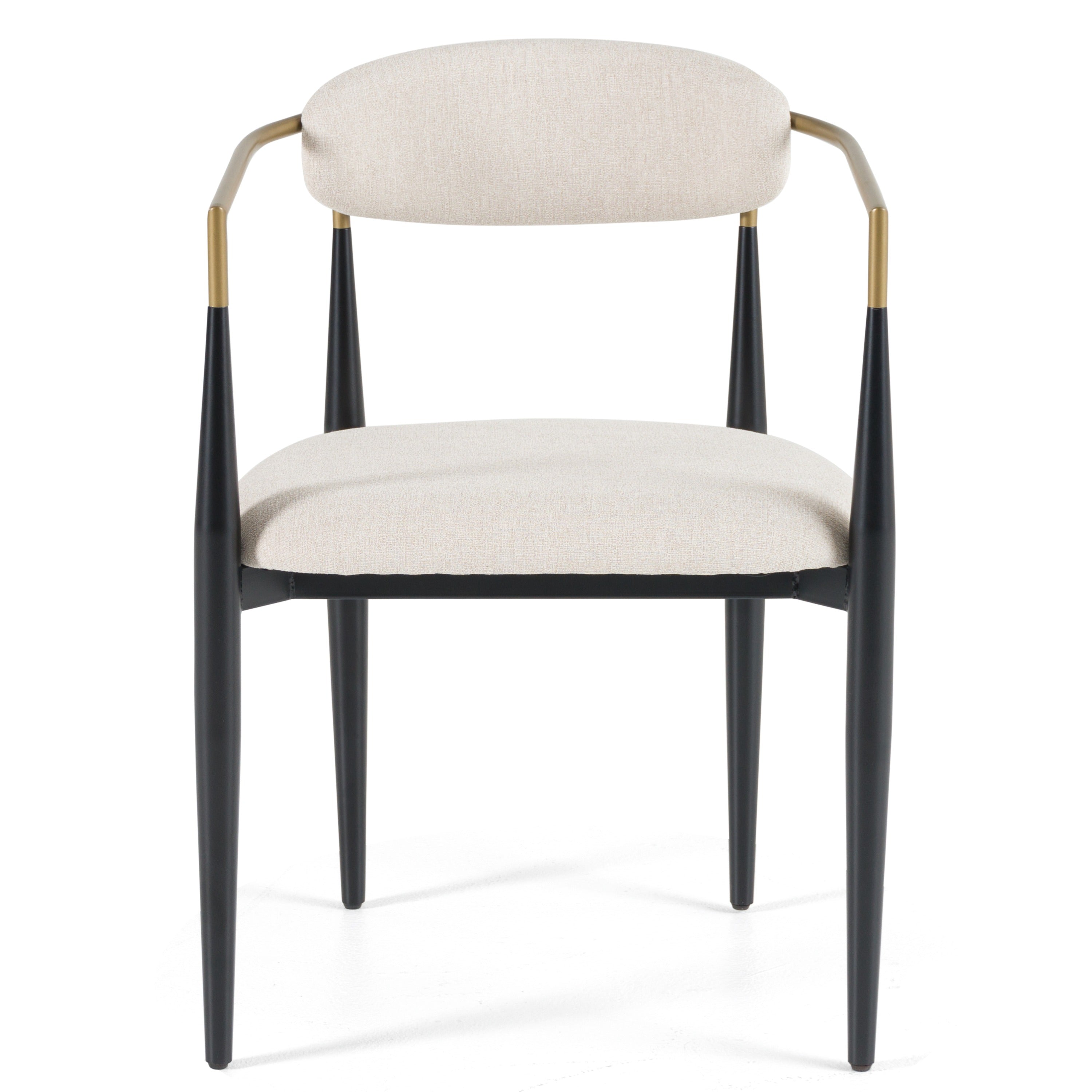 The Modern Buchtel Dining Chair - combines excellent quality materials and superb design that makes it a stunner in your dining room. The light grey fabric upholstery back & seat cushion and black & gold metal arms and legs bring style and elegance to a dining experience. The Buchtel also comes in a counter height chair.