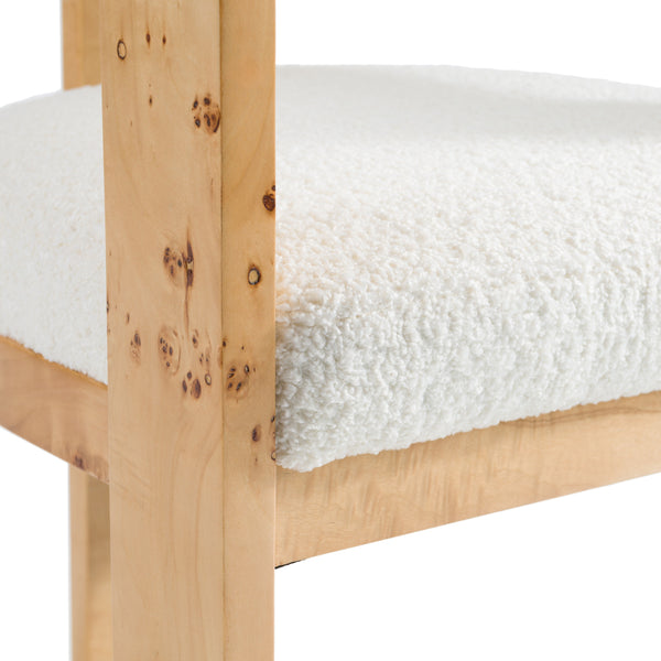 The Modrest Letha Modern Cream Fabric and Burl Dining Chair effortlessly merges organic textures with modern luxury, making it an iconic piece for the refined home. Upholstered in sumptuous cream fabric, the chair offers both comfort and elegance, while the natural burl wood veneer showcases stunning variations that evoke a sense of artistry and nature. With its graceful wingback design and brass-accented tripod legs, this dining chair brings a bold yet sophisticated statement to any dining space. Ideal for those who appreciate craftsmanship and subtle opulence, the Letha elevates the ambiance of any modern setting.