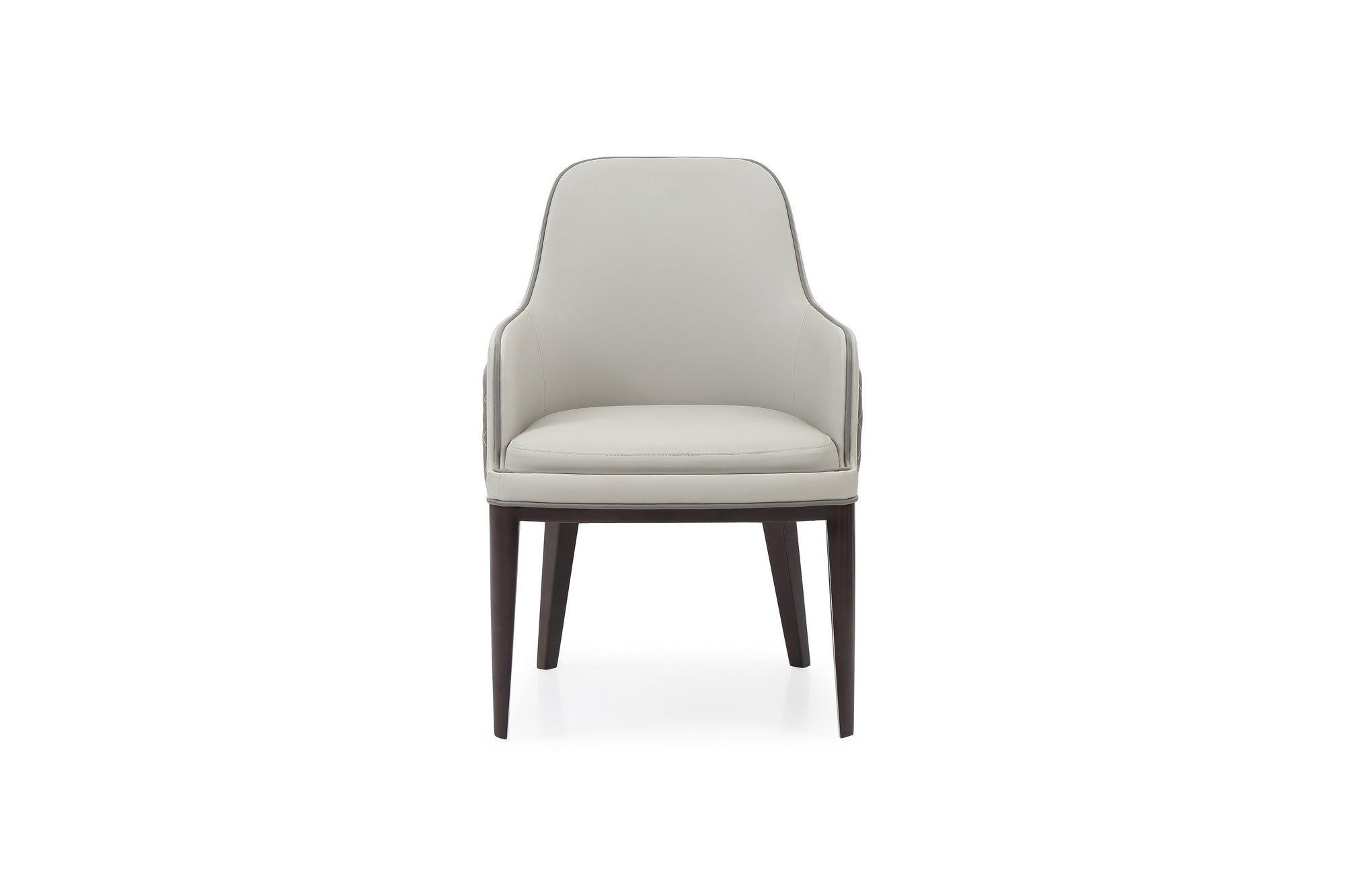 The Maxwell Dining Chair is the perfect contemporary piece for any dining room. The beige bonded leather upholstered seat is accented with a dark grey piping. The dark grey bonded leather accent pieces along the back are diamond stitched in a contrasting white thread. This elegant touch elevates the chair making it perfect for a formal area.