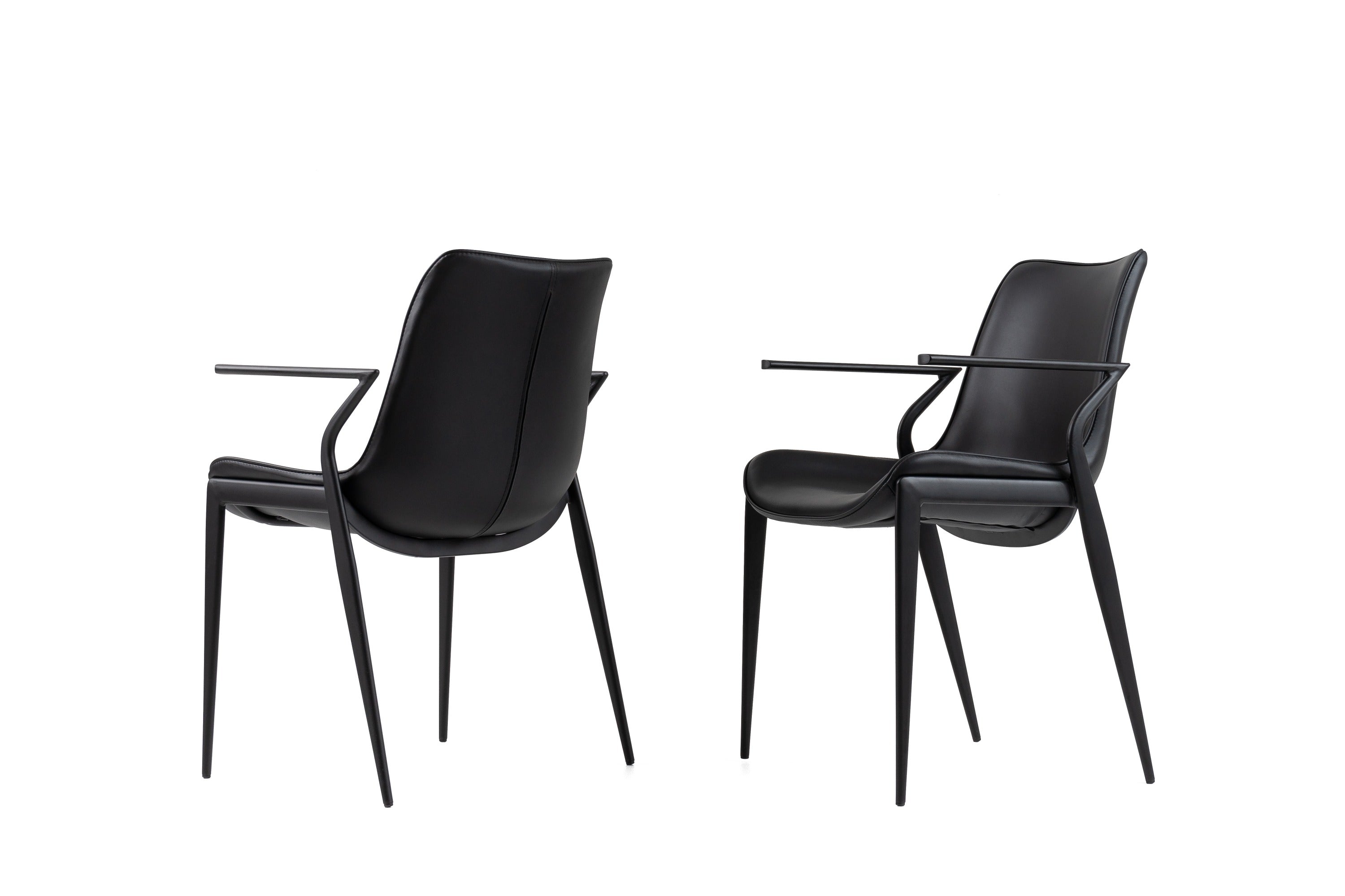The Modrest Osprey Modern Black Vegan Leather Dining Chair set exudes contemporary elegance with its sleek silhouette and minimalist design. Upholstered in luxurious black vegan leather, these chairs feature a smooth, curvaceous backrest and comfortable armrests, enhancing both style and support. The slender, tapered legs add a touch of sophistication, perfect for modern dining spaces. Ideal for chic dining rooms or trendy cafes. This set includes two chairs, perfect for enhancing any dining experience.