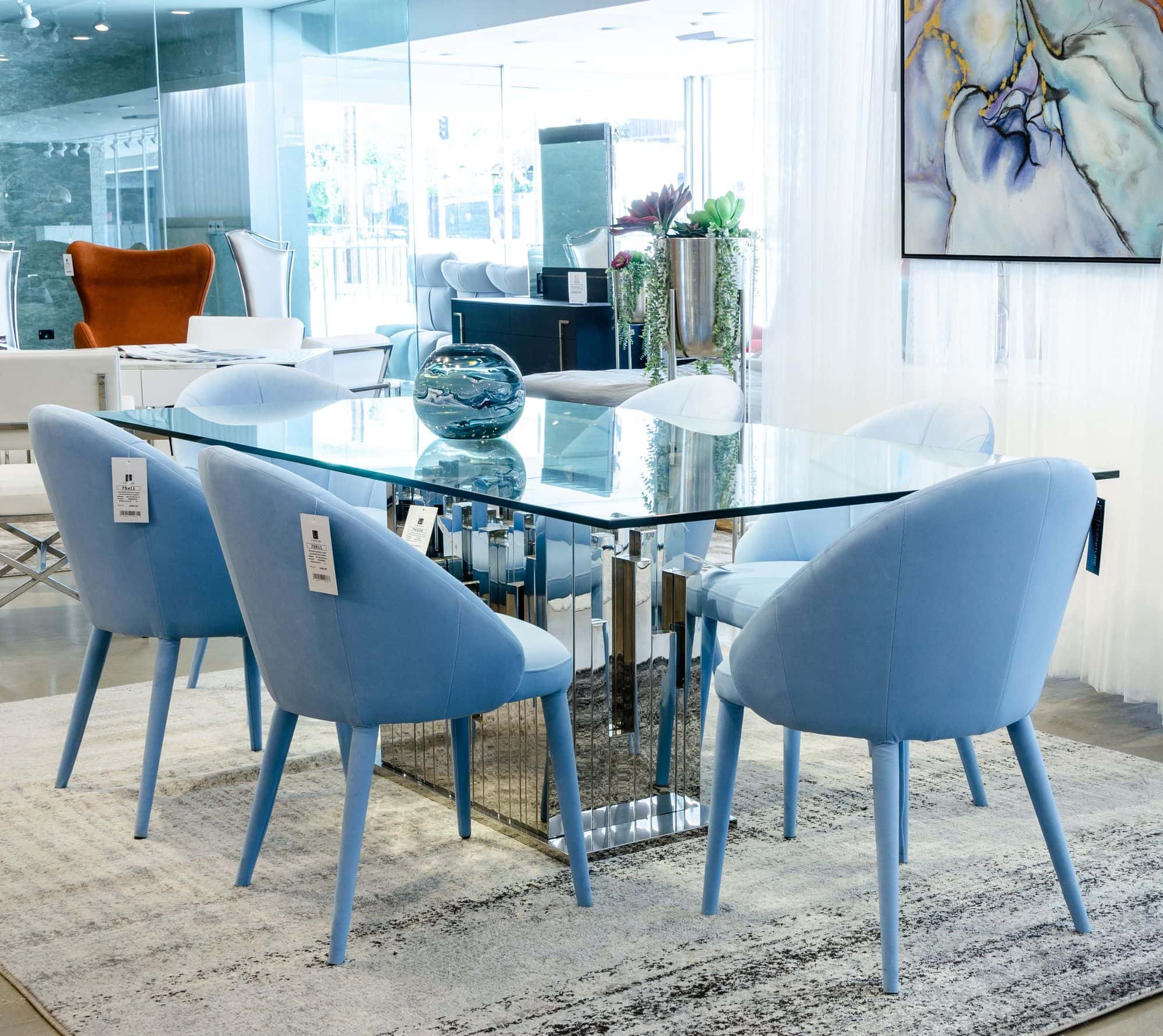 The Sanders dining chair is upholstered in an icy blue velevt, features a curved back with sloping arms, channel tufting on the front of the back rest, and fully covered tapered legs. the chair can be used in a mid-century or contemporary subtext.