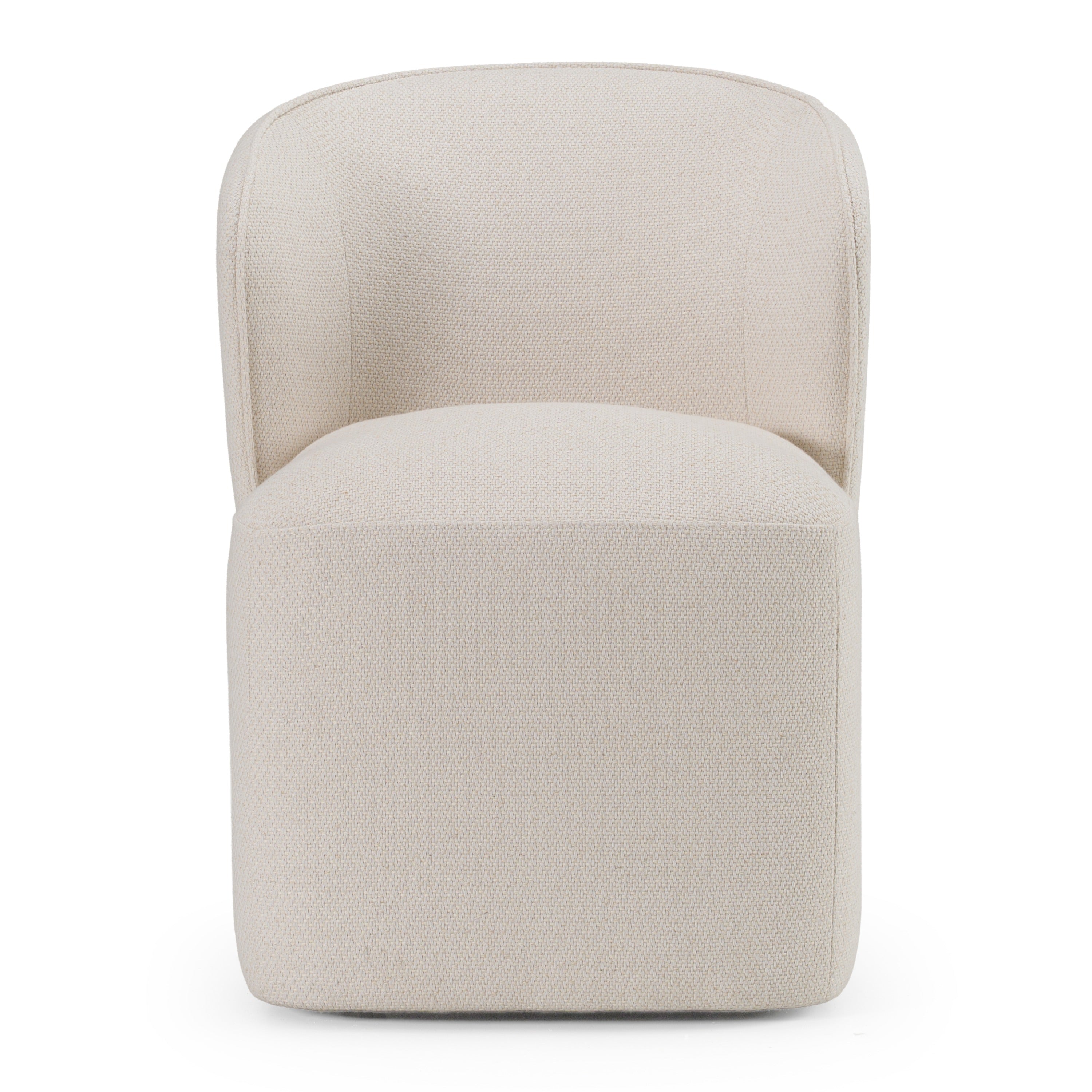 The Modrest Souza Modern Beige Fabric Swivel Dining Chair showcases a sleek, contemporary design with soft curves and a plush, inviting upholstery. Its rounded backrest and minimalist silhouette create an elegant yet comfortable seating option ideal for modern dining spaces. The swivel feature adds practicality, enhancing accessibility around the table, while the neutral beige color seamlessly complements various interior styles. Perfect for both casual gatherings and formal dining, this chair combines aesthetic appeal with functional comfort.