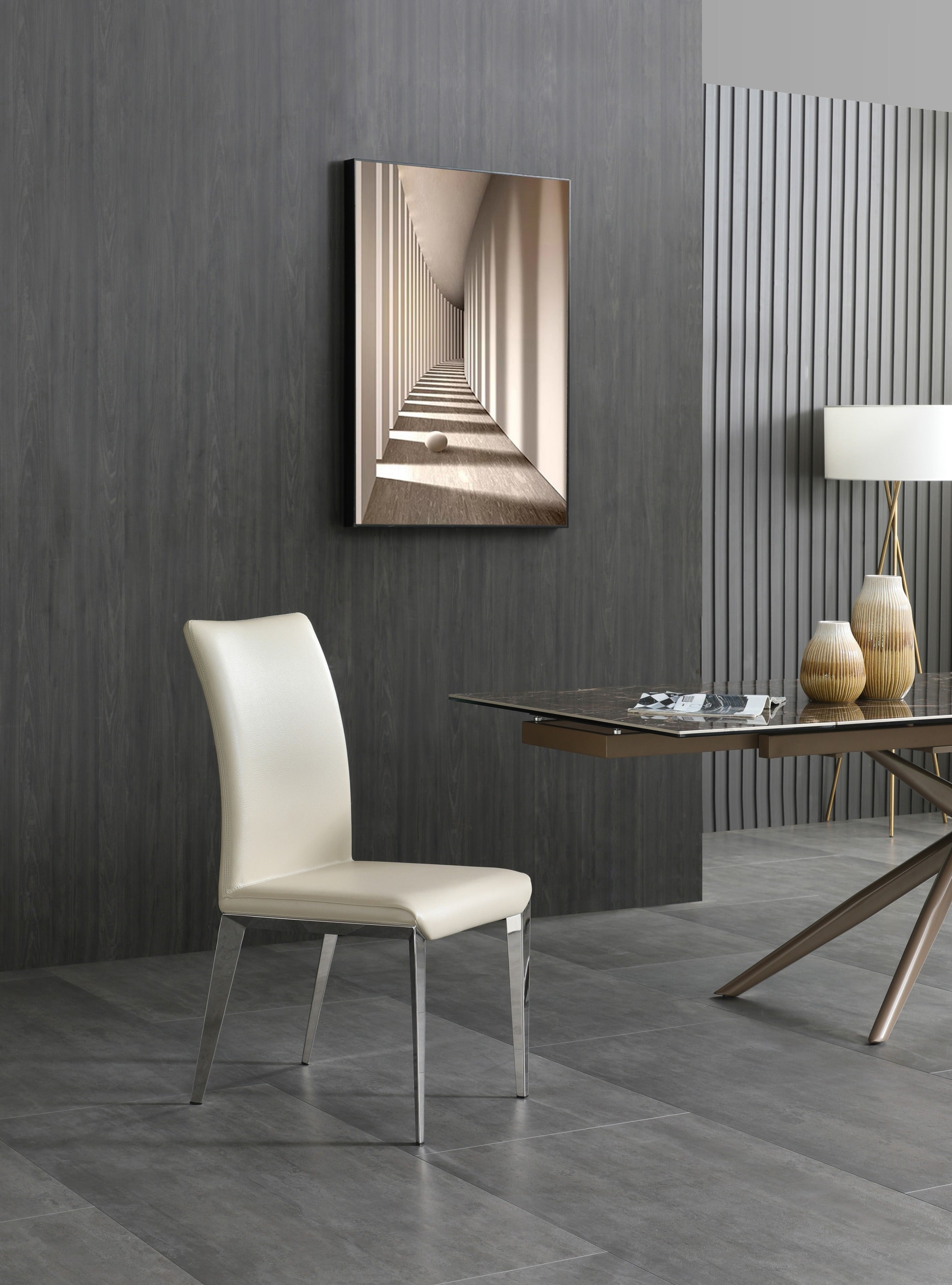 This set of 2  Taryn - Modern Light Grey  &  Stainless Steel Dining Chair features a dainty triangular stainless steel frame upholstered in dainty light grey leatherette. This modern dining chair with medium-height back features curved corners and back edge. Rubber stoppers on legs prevent damage on your floor.
