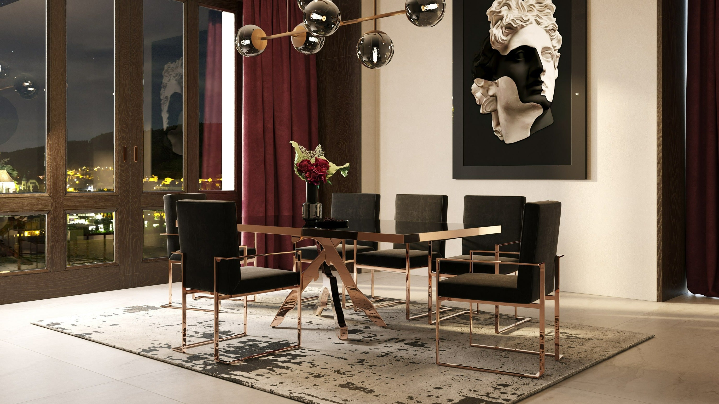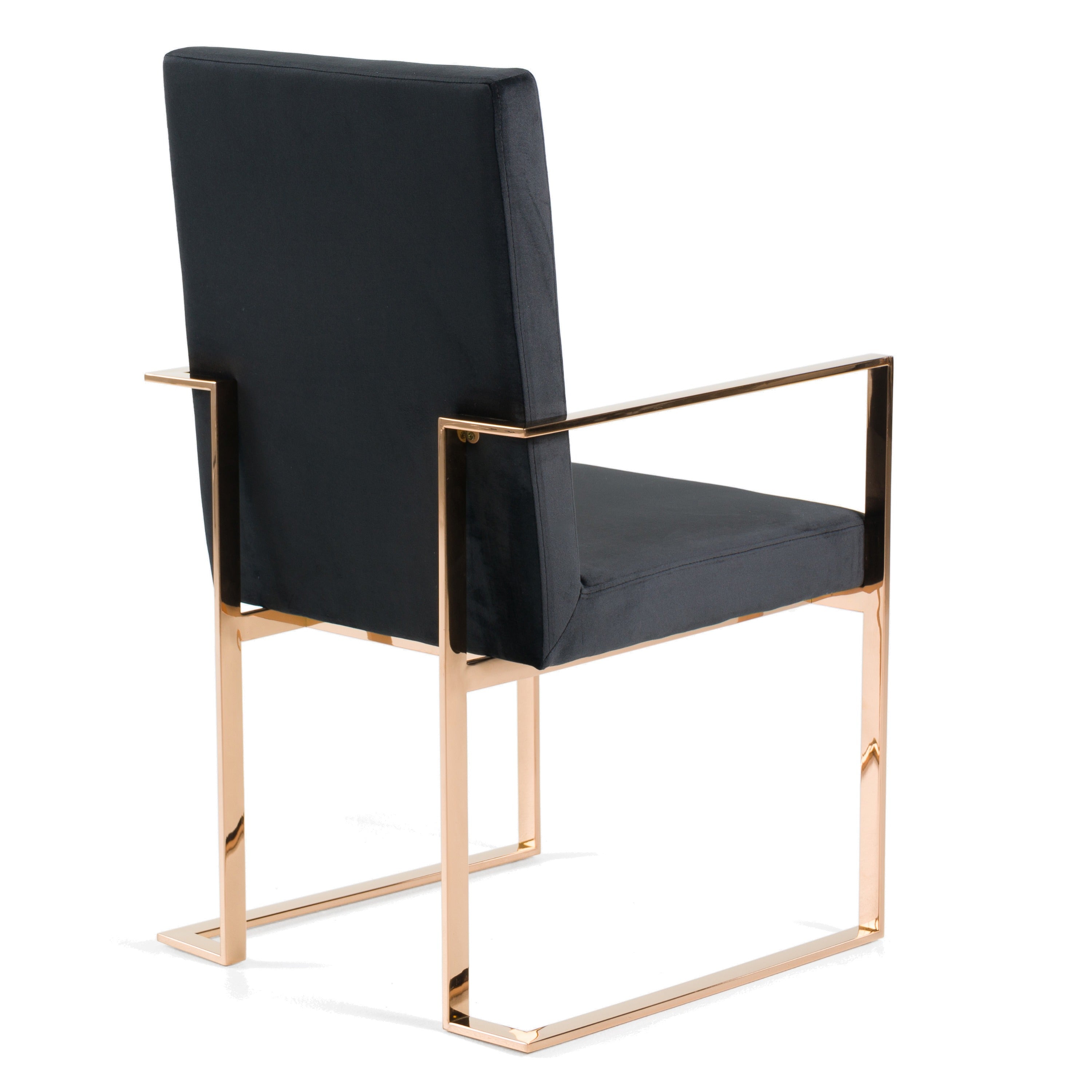 The Trea Dining Chair contrasts well with its soft-lined black velvet ergonomic seats scream comfort. The rose gold stainless steel frame holds a linear frame against the elegance of contrast in colors. This dining chair is perfect for a modern and sleek look.