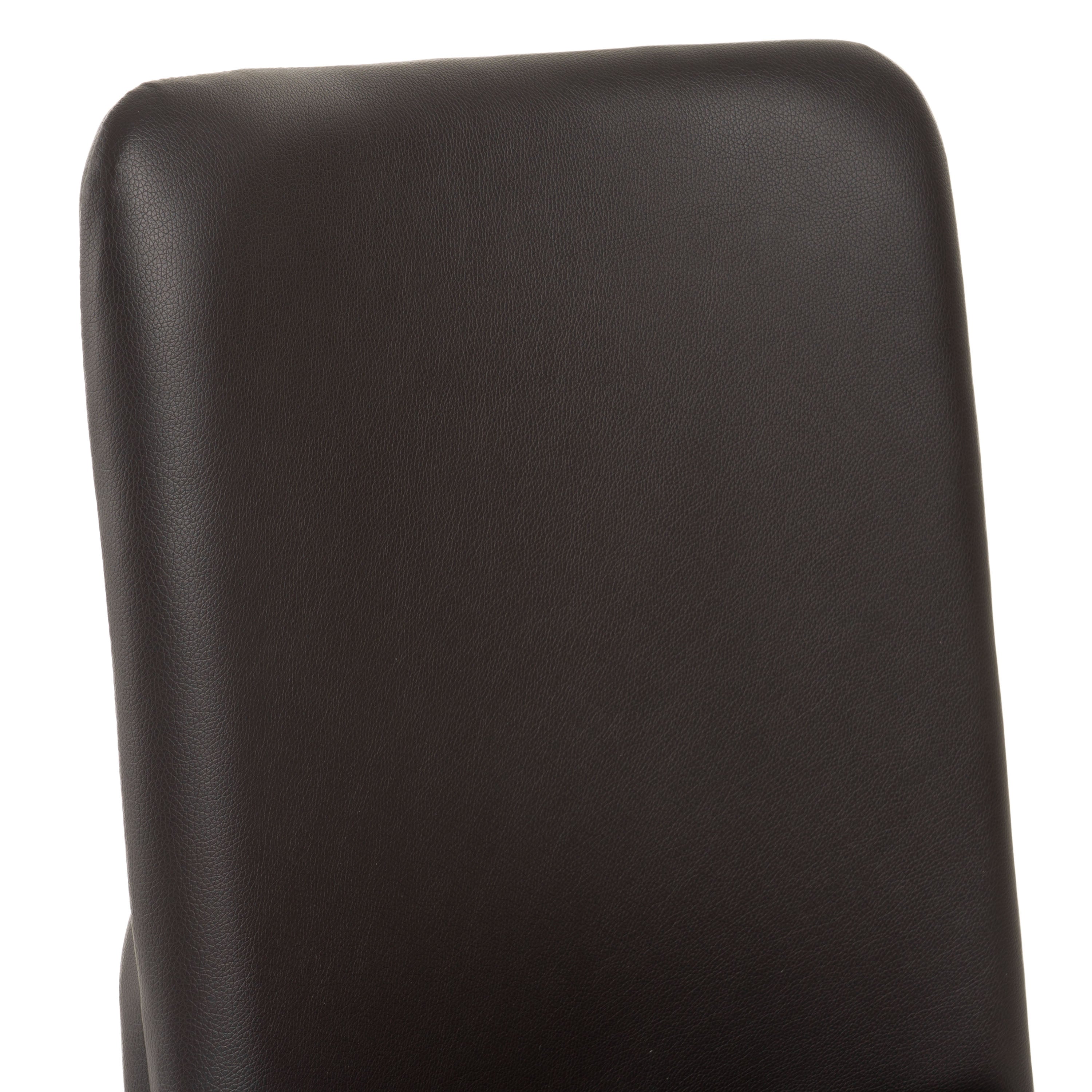 This modern walnut and brown eco-leather chair set features two dining room chairs. The chairs have solid rubberwood legs that have a walnut finish, and the seats feature a dark brown faux-leather upholstery. The chair backs feature a curved line, which can help provide back support.