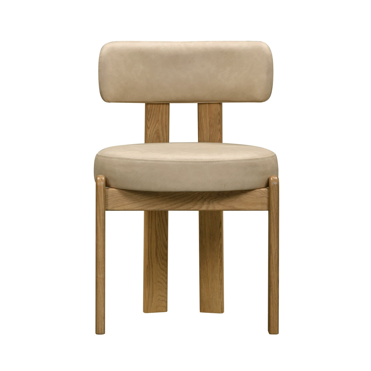 The Odessa Dining Chair delivers retro flair with its Memphis-inspired curves, earthy wood frame, and wipeable vegan leather in cream or saddle brown. High-comfort foam and easy maintenance make it a stylish win for busy spaces.