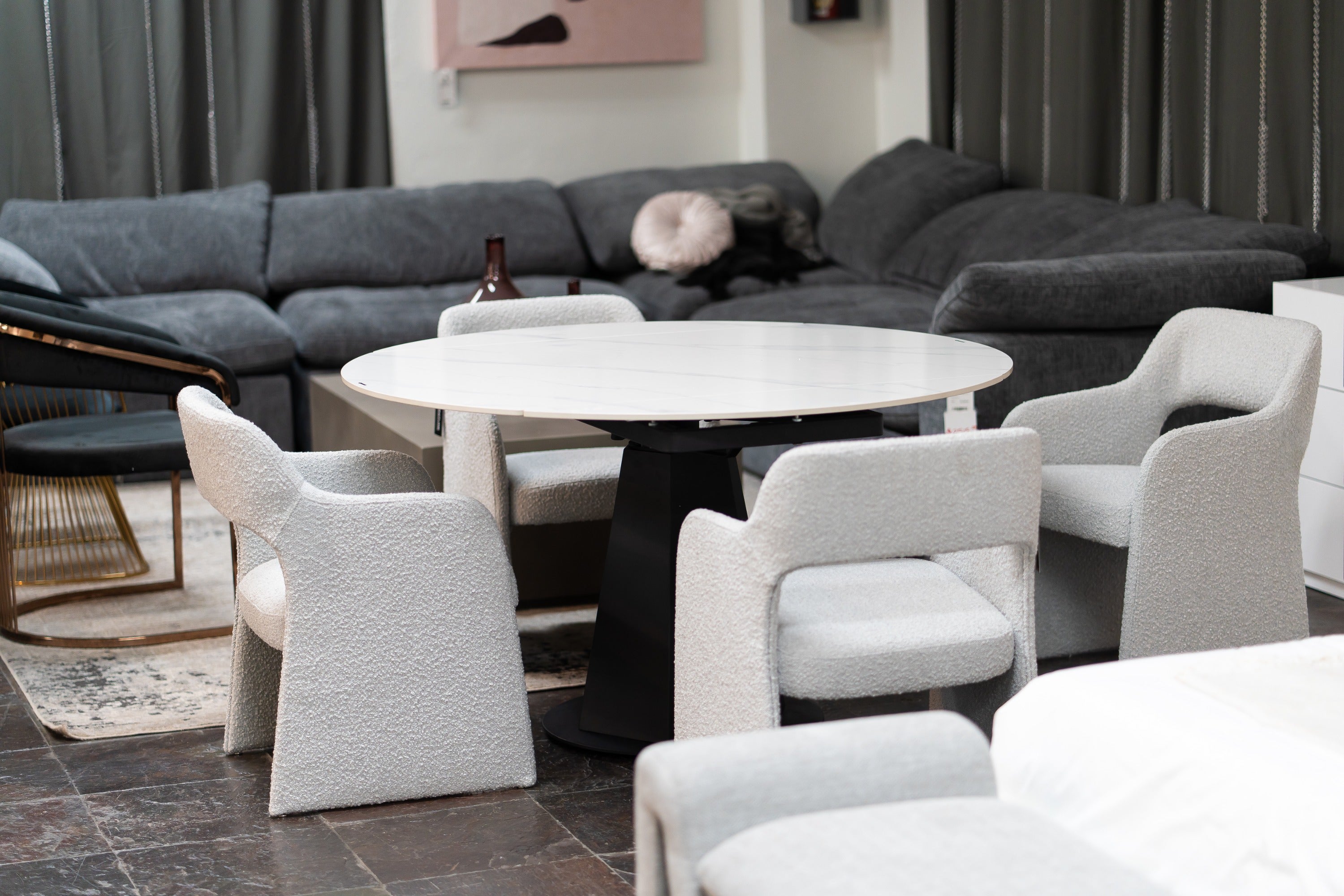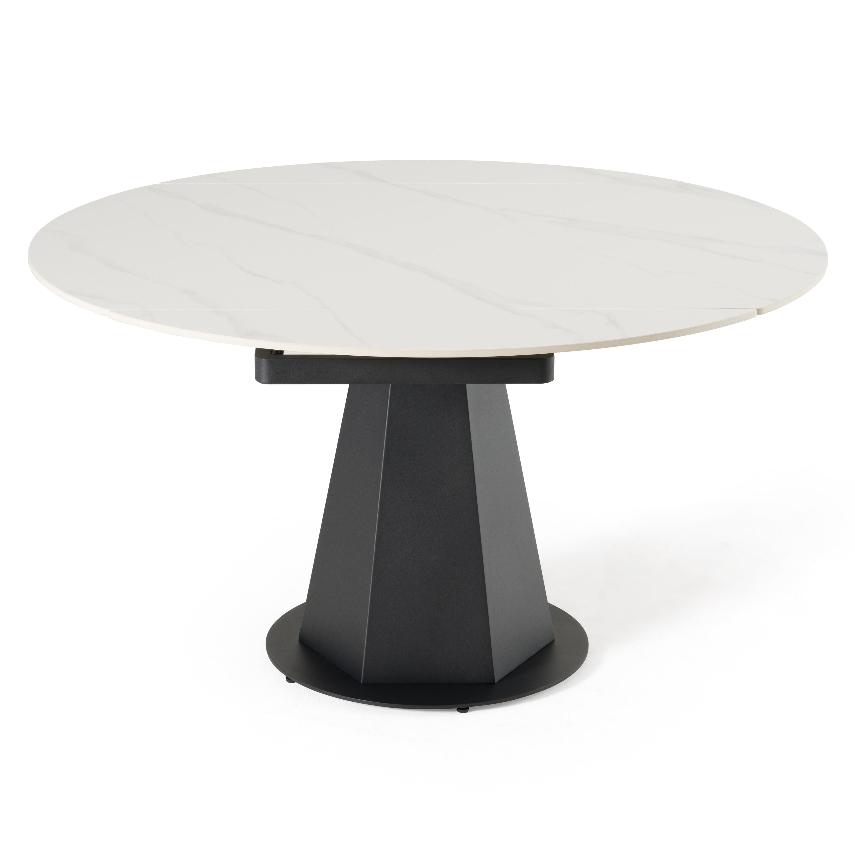 The Modrest Barela dining table combines modern aesthetics with practical functionality. Its black and white ceramic top exudes elegance, resembling luxurious white marble. Supported by a sturdy black iron pedestal base, this rectangular table comfortably seats 4, and when fully extended, it accommodates up to 6 guests. Whether hosting an intimate dinner or a larger gathering, the Modrest Barela offers both style and versatility