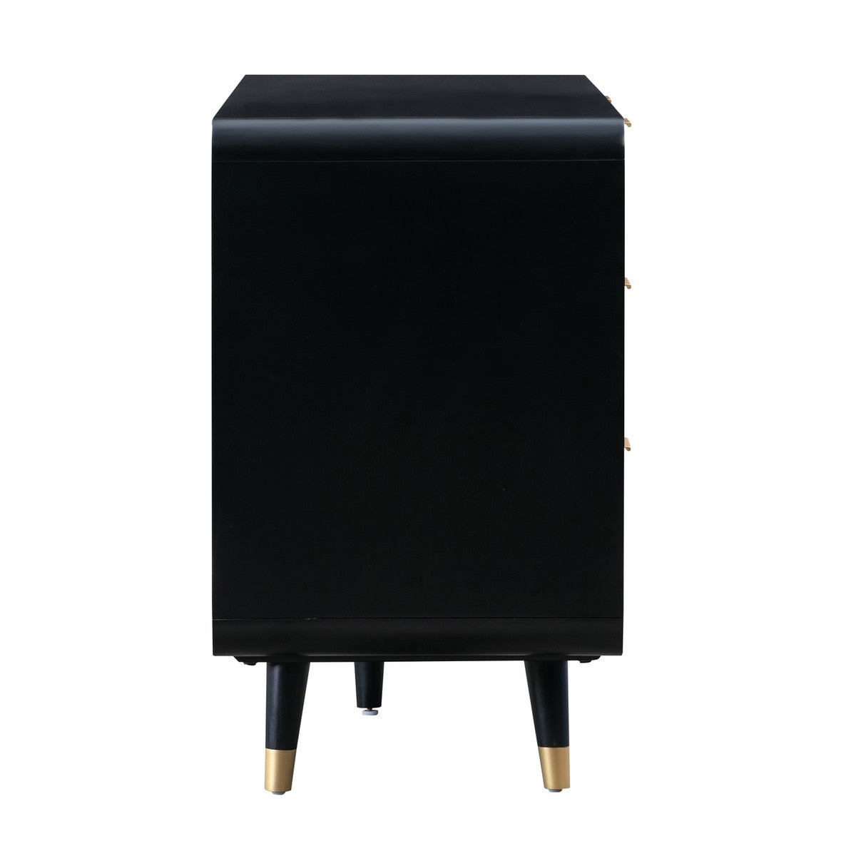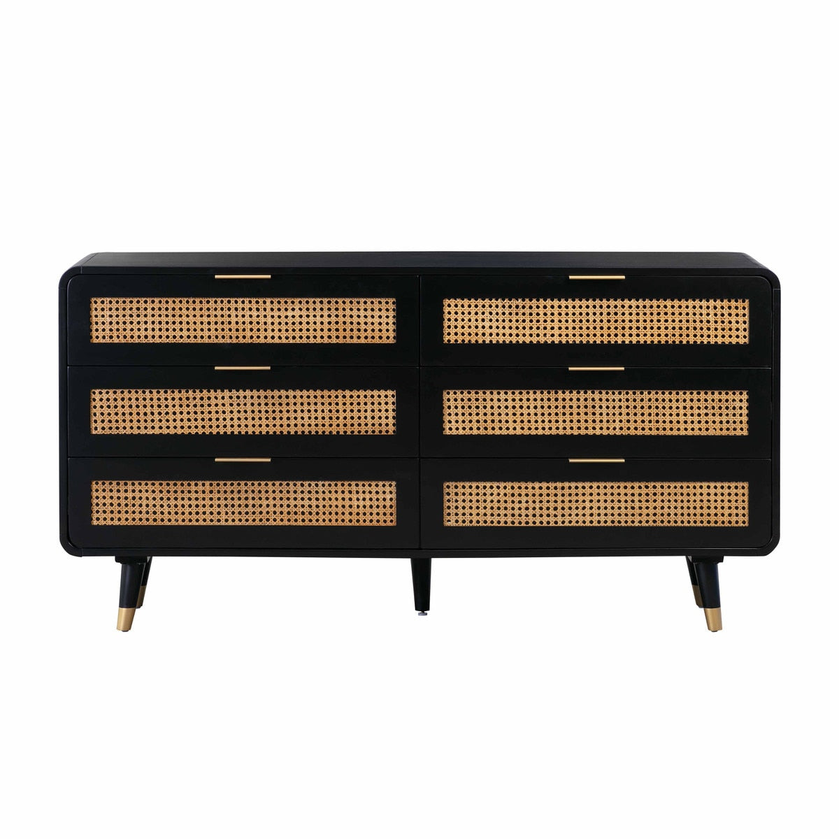 Drawing inspiration from the ever classic mid-century style, the Christine dresser adds a retro look to any space its placed. This dresser features spacious drawers, a black Acacia finish embellished with cane webbing and conical legs to complete the look.
