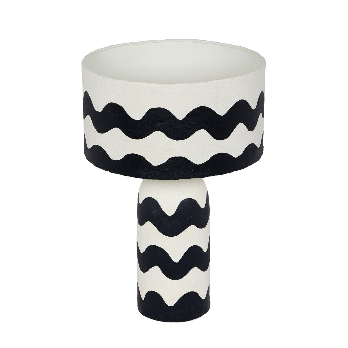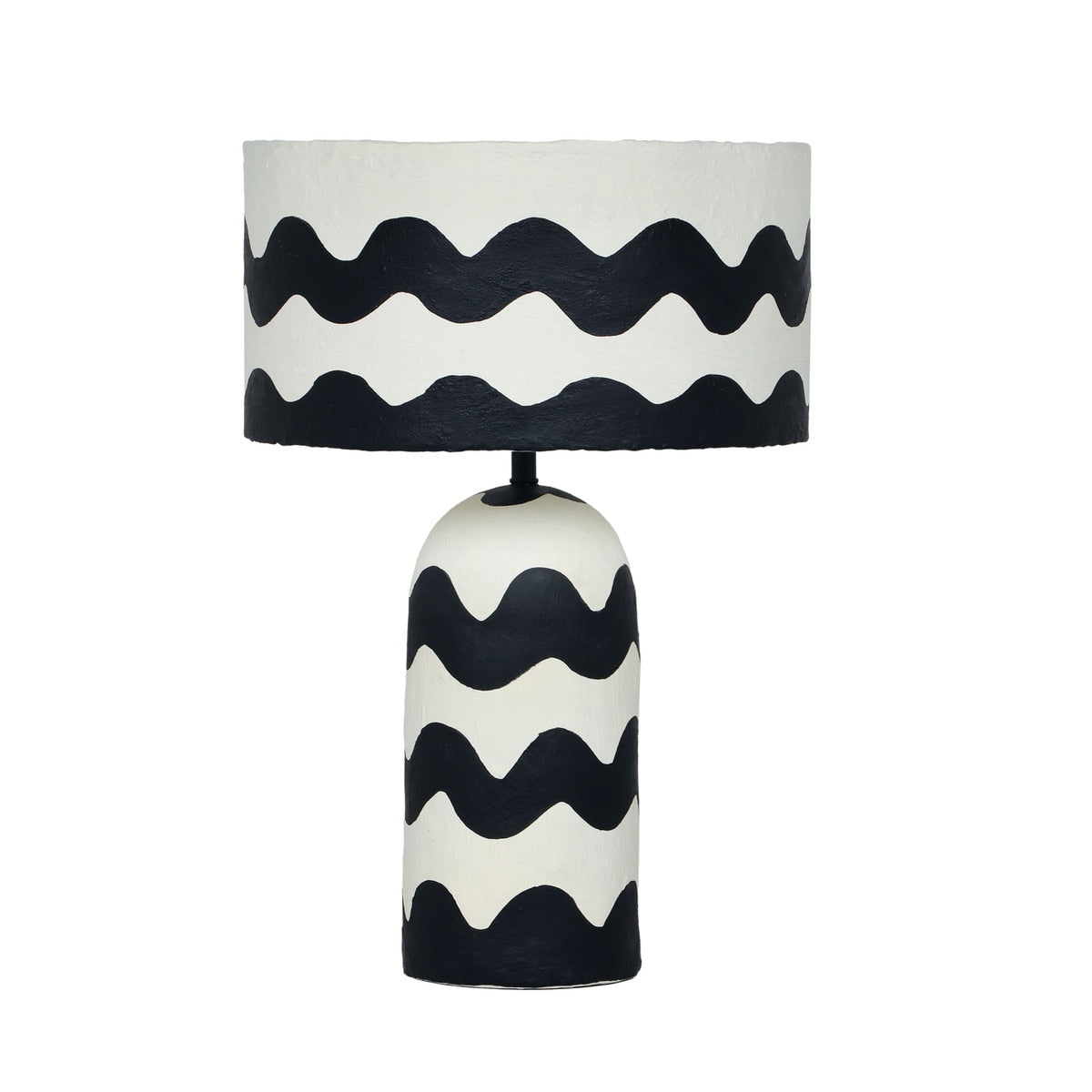 Illuminate your space with the artistic flair of the Tropea Black Waves Papier Mache Table Lamp. Crafted with innovative paper mache construction, the lamp boasts a captivating textural finish that adds depth and character to any room. The painterly black and white waves design further enhances its visual appeal, making it a striking and organic accent piece for your home. Place it virtually anywhere for an instant zhuzh.