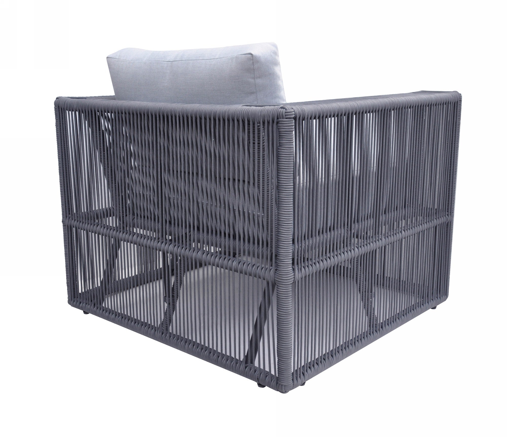 The Whimsey Modern Outdoor Light Grey & Dark Grey Sofa Set comes with two accent chairs, a loveseat, and a coffee table. The dark grey rope weaves over the sturdy aluminum frame created a deconstructed, industrial look. The upholstery is executed with a light grey waterproof fabric, meant to withstand the elements. Perfect to showcase your farmhouse style porch.