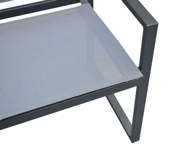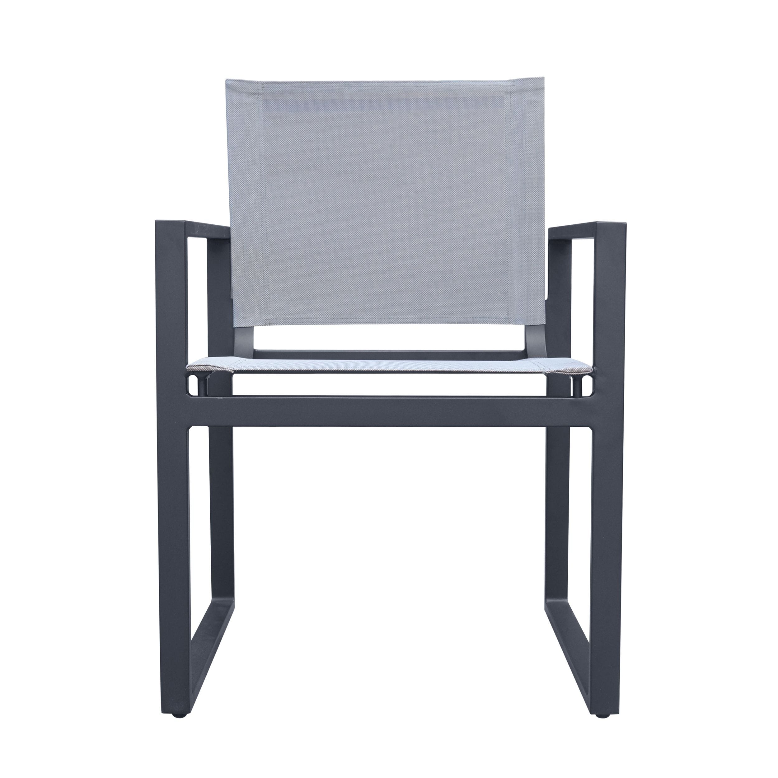 Simple and clean lines give the Renava Wake & Kayak Modern Outdoor DIning Set. The Wake Table is the perfect center piece to complete your outdoor dining set. The charcoal aluminum metal that makes up the structure of this table is lightweight and capable of resisting the weather. The striking color and modern lines make this a perfect set for a modern or contemporary home. The two Kayak Outdoor Armchairs are placed at the ends of the table while the (armless) Kayak Outdoor Chairs bring the total seating arrangement up to 8.