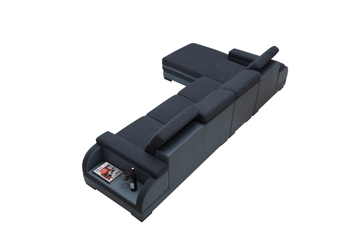 The Divani Casa 5132 Modern Fabric & Bonded Leather Sectional Sofa features a down-to-earth design upholstered in NATP-79 blue fabric/grey HX001-32 bonded leather/PVC. It features a left facing chaise and 'Flip-up' headboards that enhanced its relaxed appeal with a bookshelf on the track armrests. This modern sectional sofa is available by special order in 10-16 weeks.